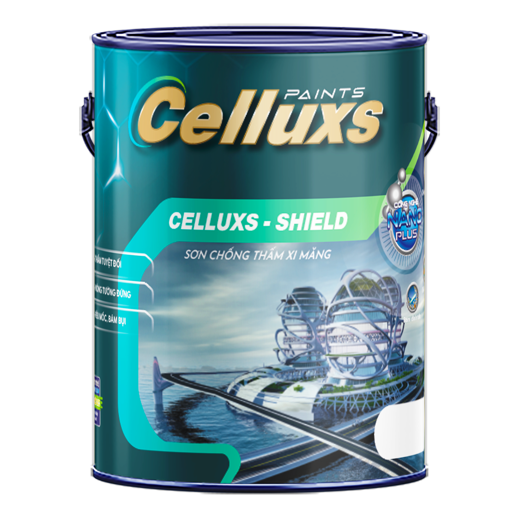 | Celluxs-Shield: Sơn chống thấm đa năng cao cấp là chất chống được tổng hợp từ Acrylonitrile và Alkylsinoxa. Celluxs-Shield dạng lỏng hệ nước được dùng dưới dạng tổng hợp với xi măng theo tỉ lệ 1:1 để chống thấm cho xi măng, bê tông, có tác dụng ngăn chặn sự thấm nước từ ngoài vào, nhưng bề mặt vẫn bốc hơi nước dễ dàng. Là chất chống thấm thích hợp cho cấu trúc bê tông, nền, tường xi măng như: đường hầm, bể nước, bể hơi, sân thượng, nền nhà, bờ tường, sàn nhà vệ sinh.