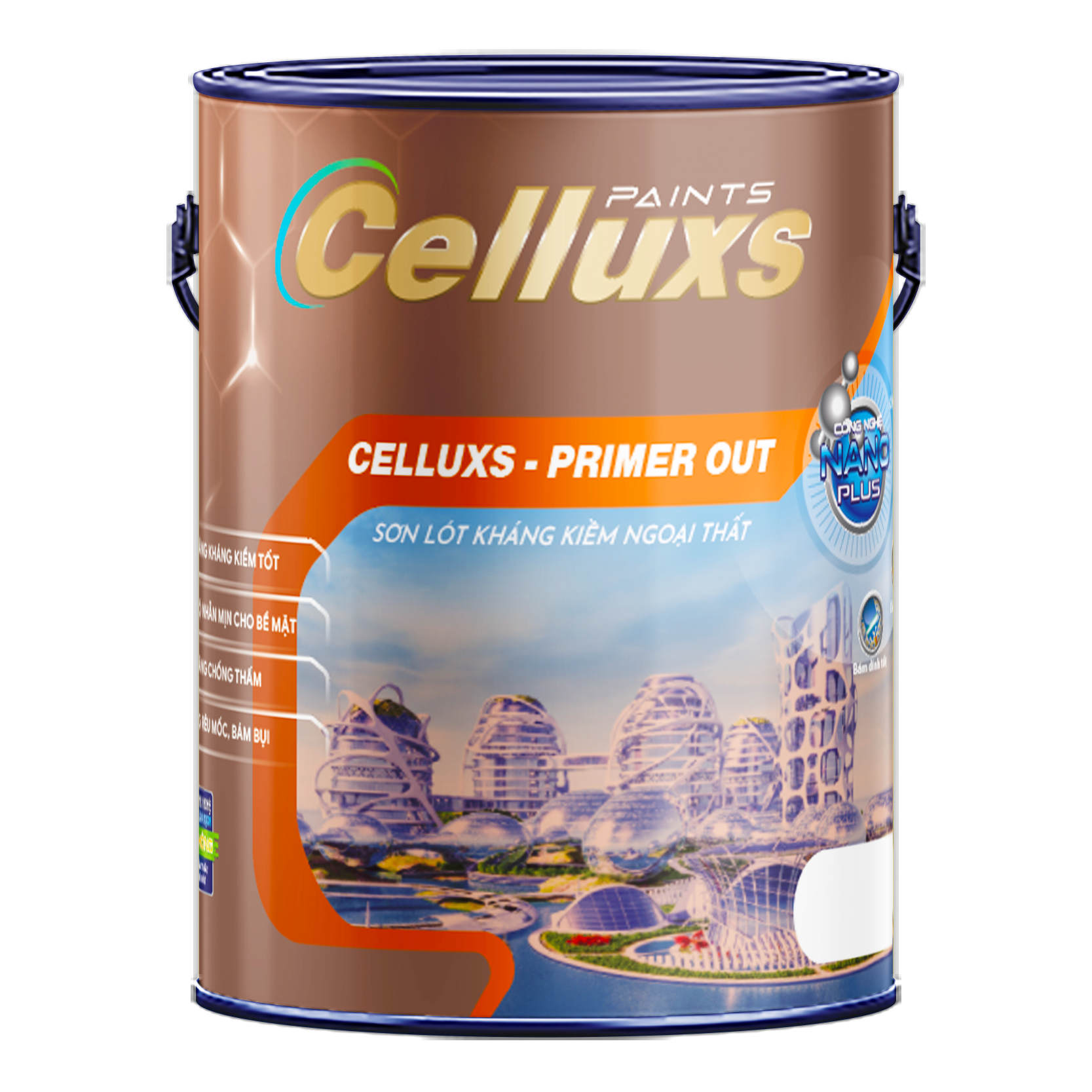 Cellux-Primer out: Sơn lót ngoại thất cao cấp là loại sơn lót ngoại thất cao cấp tổng hợp từ nhựa Acrylic nguyên chất, trong thành phần sơn chứa hàm lượng Titan rất cao nên màng sơn cứng vững, tăng cường khả năng bảo vệ, khả năng kháng kiềm và các chất hóa học tốt, được dùng sơn lót bảo vệ vững chắc cho tường và bề mặt xây vữa ngoài nhà.